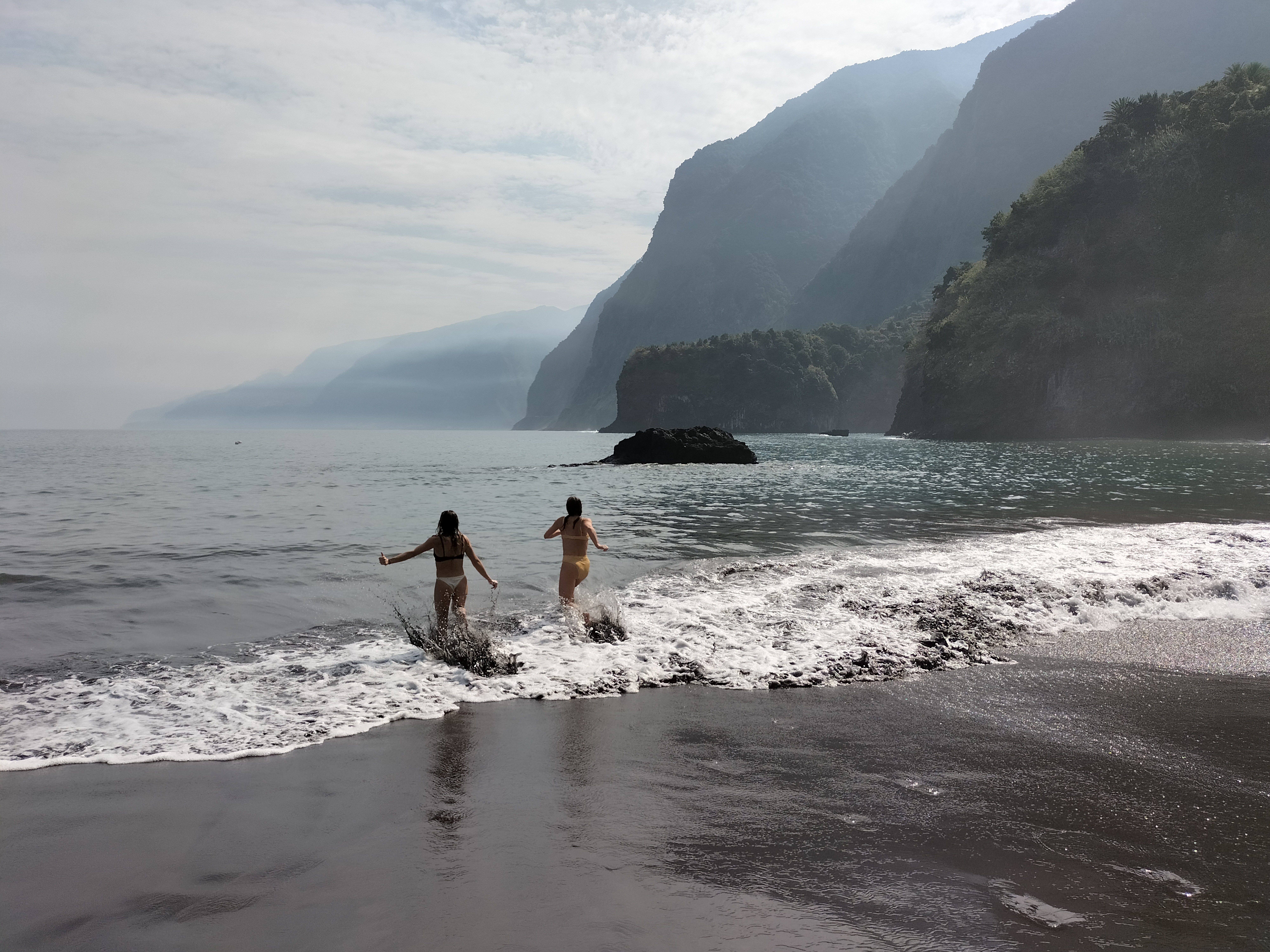 Mucho menos masificada porque se encuentra fuera de las rutas turísticas principales y apenas tiene aparcamiento, la Praia do Casi, de arena negra, situada en el puerto de Seixal nos encantó; especialmente esa refrescante cascada.